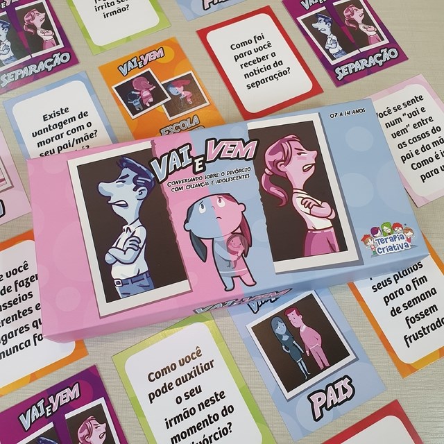 O rompimento de um casamento implica em luto para as crianças e adolescentes. Há perda da rotina, dos papéis construídos e constituídos. Sentem que estão perdendo sua família. E agora ficam num vai e vem entre casas, entre estilos de vida, e às vezes entre conflitos e alívios. “Vai e Vem” é um jogo com cartas sobre pais, irmãos, brigas, escola, amigos, e família, entre outros assuntos, para promover uma conversa leve sobre as angústias do divórcio com crianças e adolescentes, enquanto você terapeuta reúne as informações necessárias para ajudá-las a encontrar um significado para as mudanças que estão vivendo.