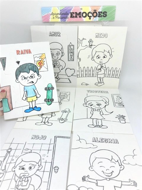 O Quebra-cabeça das emoções, possibilita que a criança além de montar, possa pintar a personagem e sua emoção.