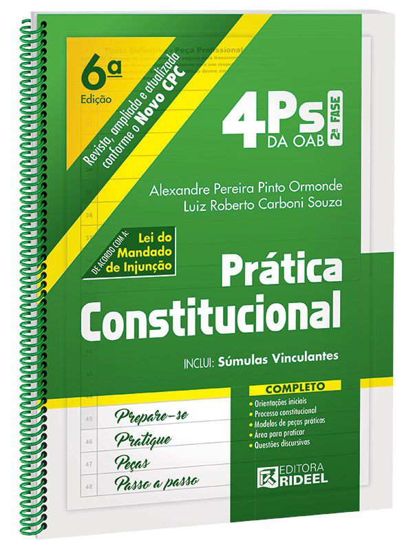 Cientes da necessidade dos examinandos e após detida análise dos editais da FGV, a Editora Rideel criou a coleção 4Ps da OAB. Trata-se de material didático, escrito com linguagem acessível por professores especialistas na preparação para o Exame de Ordem. As obras trazem dicas de estudo, teoria básica de cada disciplina, modelos de peças e questões comentadas dos últimos Exames. Trazem, ainda, diversas peças com espaço de 150 linhas (padrão do exame), para que o leitor treine a resolução de peças práticas, como se estivesse no dia da prova. COMPLETO: Orientações iniciais Processo constitucional Modelos de peças práticas Área para praticar Questões discursivas Obra Revista, ampliada e atualizada conforme o Novo CPC e de acordo com a Lei do Mandado de Injunção Inclui Súmulas Vinculantes