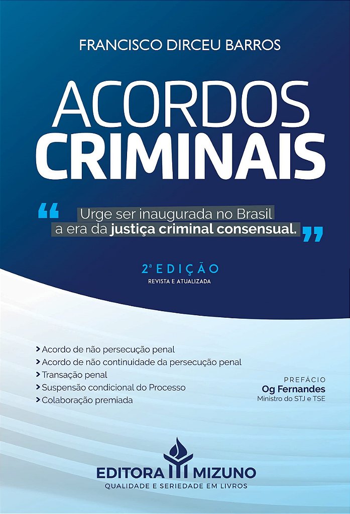 O processo penal moderno chegou ao Brasil, no entanto, velhos paradigmas devem ser elididos, com a leitura deste livro você firmará a convicção que não é mais possível fundamentar a ciência jurídica com princípios e normas originadas do século XVIII.Como afirma o Ministro do STJ e TSE, Og Fernandes: “O livro que me apraz aqui referenciar contém estudos pacientemente realizados sobre a principiologia geral e estruturante dos acordos criminais. Enfrenta as raízes dogmáticas aliás, com interessantíssima menção às velocidades do Direito Penal e culturais, que ainda creditam exclusivismos éticos à restrição de liberdade corpórea como único resultado possível às culpas mais graves, estabelecendo premissas firmes para os passos direcionados à dogmática”.Convido-o a mergulhar nas bases principiológicas do processo penal moderno, na certeza de que a porta de saída da justiça brasileira é adoção do direito criminal consensual como prima ratio.