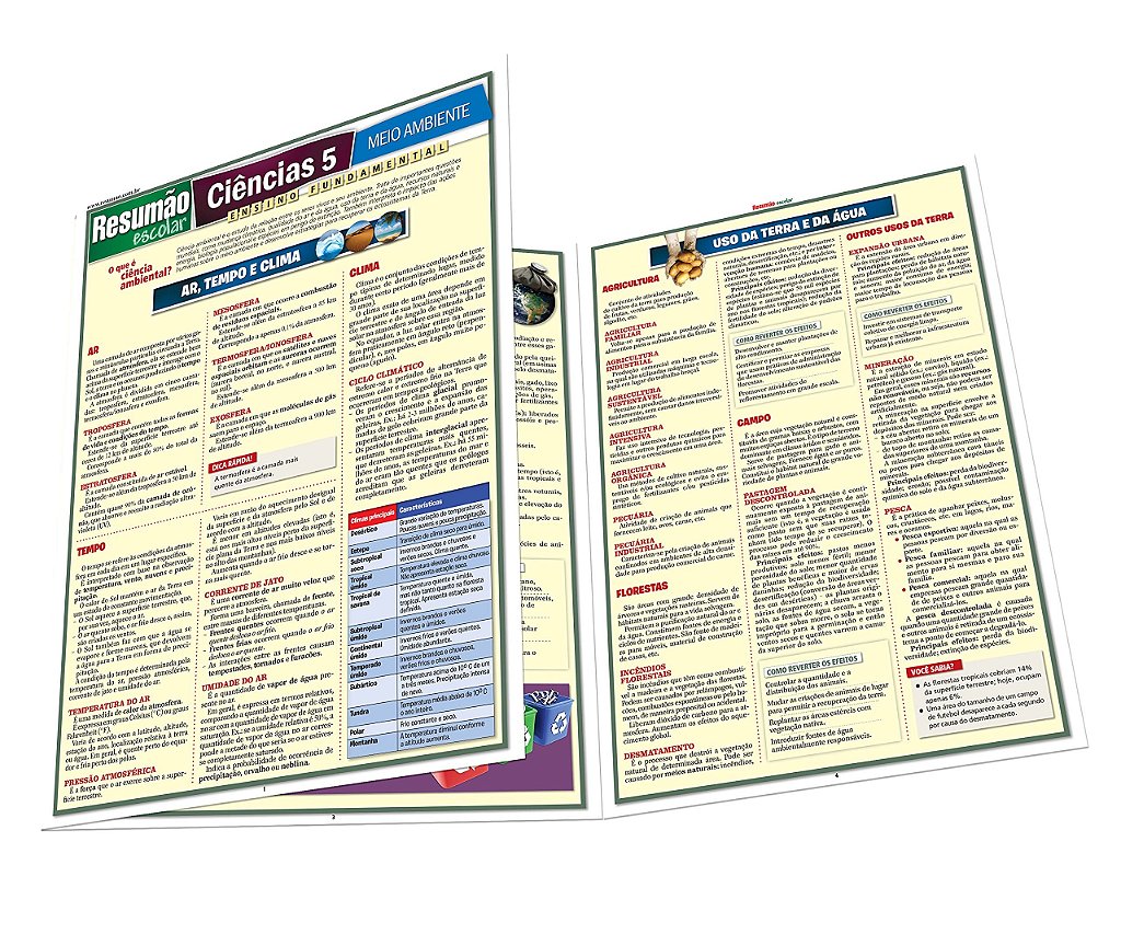 Um guia de estudo sobre a ciência ambiental. Você vai aprender os principais conceitos: ar, tempo, clima e mudança climática (fatores naturais e fatores causados pela atividade humana, problemas ambientais como efeito estufa, esgotamento da camada de ozônio e aquecimento global). Informações sobre o uso da terra e da água (agricultura, florestas, campo, expansão urbana, mineração e pesca); recursos naturais; biologia populacional; manejo do lixo e espécies em perigo.RESUMAO ESCOLAR - CIENCIAS 5 - MEIO AMBIENTERESUMAO ESCOLAR - CIENCIAS 5 - MEIO AMBIENTE