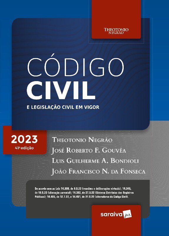 Chegou ao mercado a tão aguardada edição 2023 do consagrado CÓDIGO CIVIL E LEGISLAÇÃO CIVIL EM VIGOR, mantendo a essência de uma obra que se destaca pelos minuciosos comentários artigo por artigo, acrescidos de conteúdo doutrinário, as principais decisões de Tribunais e referências a outros artigos e leis. Trata se de obra imprescindível aos profissionais do Direito e também aos estudantes que ingressam ao estágio em Direito e que necessitam de informações seguras e precisas a respeito de todo o universo do Direito Civil. A presente 41 edição está de atualizada de acordo com as Leis 14.309, de 8.3.22 (reuniões e deliberações virtuais), 14.340, de 18.5.22 (alienação parental), 14.382, de 27.6.22 (Sistema Eletrônico dos Registros Públicos), 14.405, de 12.7.22, e 14.451, de 21.9.22 (alteradoras do Código Civil). Data de fechamento da edição: 6-1-2023.
