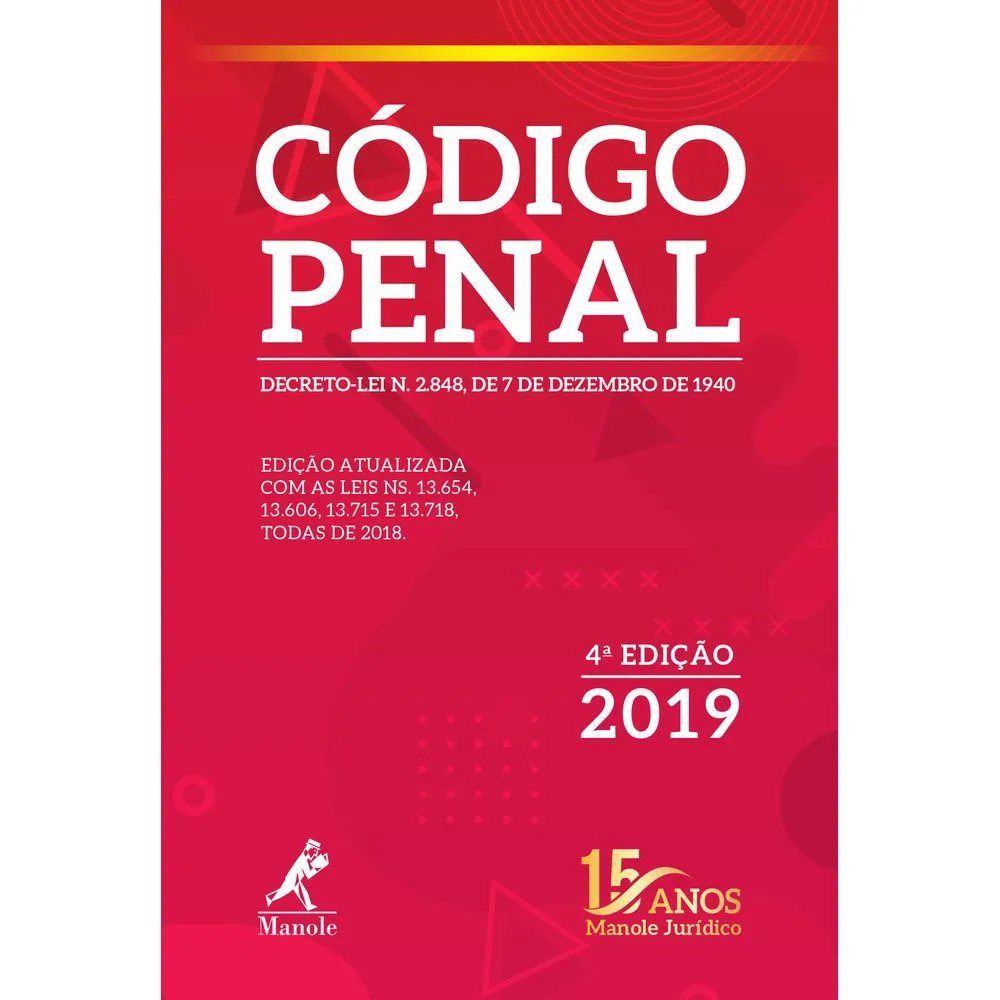 A EDITORA MANOLE, prosseguindo com suas publicações jurídicas, apresenta agora seu volume contendo exclusivamente o Código Penal (Decreto-lei n. 2.848, de 07.12.1940), devidamente atualizado pelas Leis ns. 13.606, 13.654, 13.715, 13.718, 13.771 e 13.772, todas de 2018. Esta edição está atualizada até o dia 03.01.2019, e o leitor poderá manter-se informado sobre as mudanças na legislação no site : Códigos Manole até 31.10.2019.