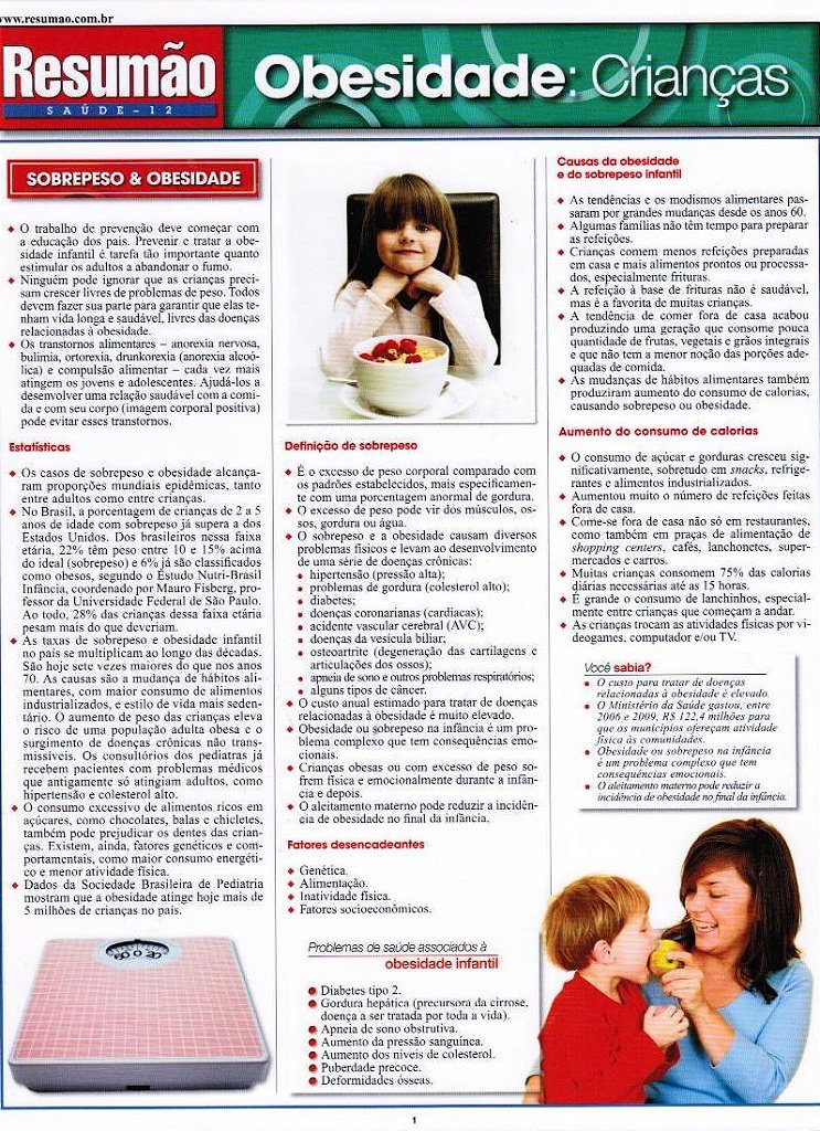 Um guia de saúde sobre um dos grandes problemas da atualidade. A diferença entre sobrepeso e obesidade, as causas da obesidade e do sobrepeso infantil. A avaliação de uma criança com sobrepeso (orientações para profissionais de saúde). Metas para o controle do peso, necessidades alimentares das crianças. Dicas para comer fora de casa. Informação nutricional nos rótulos dos alimentos e dicas para os pais.