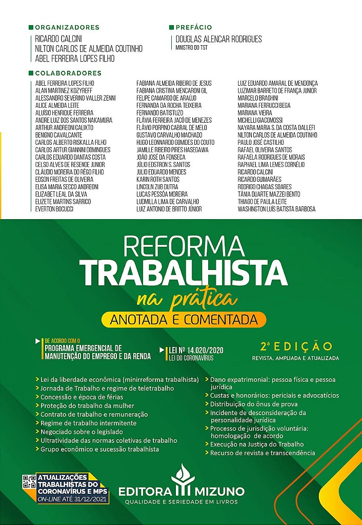Coordenada pelos professores Calcini, Coutinho e Lopes Filho, a 2 edição da obra “Reforma Trabalhista na Prática: Anotada e Comentada” foi devidamente atualizada com um objetivo específico: auxiliar o estudante e o profissional da área jurídica a compreender (e aplicar) todas as regras jurídicas decorrentes da Reforma Trabalhista, inclusive aquelas promovidas pela minirreforma trabalhista (Lei 13.874/2019), além das atuais diretrizes trazidas pela legislação do coronavírus (Lei 14.020/2020). Escrita com a colaboração de profissionais com extensa experiência acadêmica na área do direito material, coletivo e processual do trabalho, a obra analisa, de forma didática, pontual e objetiva, os artigos alterados e/ou incluídos em decorrência da Lei 13.467/2017.