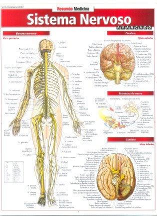 Mais de 20 ilustrações detalhadas, com indicações anatômicas para facilitar a identificação de todos os pontos do sistema nervoso no corpo humano. Estrutura do nervo, vista posterior do sistema nervoso, cérebro (vistas anterior e inferior), cabeça, rosto e pescoço, ouvido, septo nasal, nervo trigêmeo; nervos e músculos dos membros inferior e posterior, plexo lombossacral, plexo cervicobraquial; pele, medula espinal, coração, nervos frênico e vago; inervação cutânea.