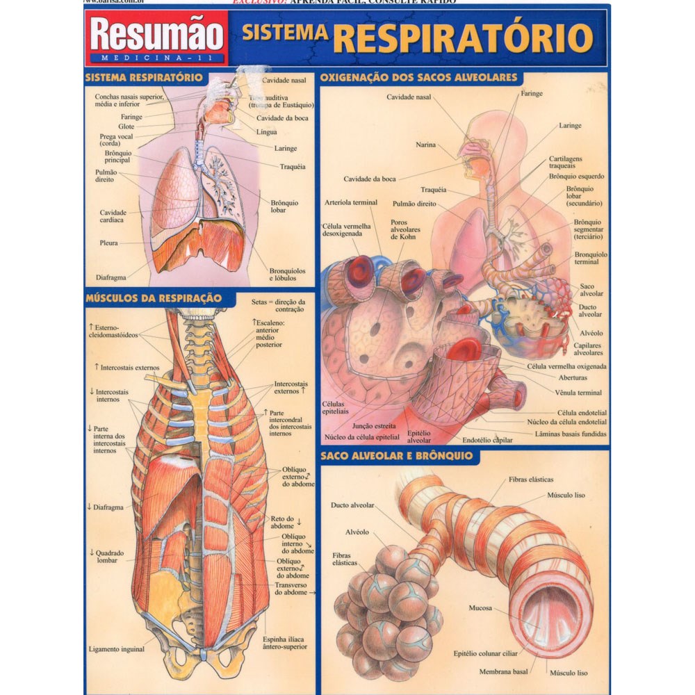 Uma dezena de ilustrações inovadoras mostram o sistema respiratório em detalhes. Os orgãos que fazem parte do sistema respiratório. Os músculos da respiração. A oxigenação dos sacos alveolares. Os sacos alveolares e brônquios mostrados em ilustração superampliada. As cavidades nasal e oral e detalhamento do septo nasal, dos seios paranasais e da laringe. Para completar: a árvore brônquica.