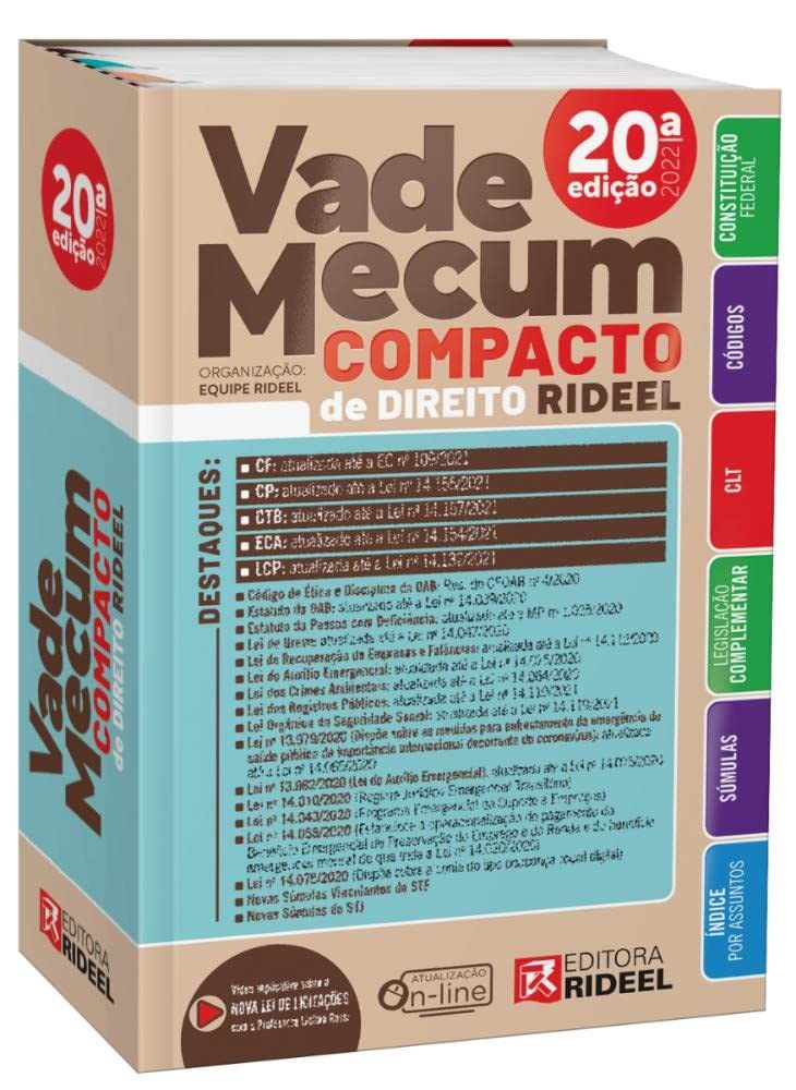 A edição 2022 do Vade Mecum Compacto de Direito traz projeto gráfico moderno, o que torna sua leitura agradável e a pesquisa pelo conteúdo rápida e dinâmica. O produto apresenta compêndio de normas fundamentais, sem exageros, para o dia a dia de profissionais, acadêmicos e concurseiros, além de CF, principais Códigos, Legislação Complementar Geral e Súmulas dos Tribunais Superiores. Conta, ainda, com índices sistemáticos e alfabético-remissivos. Para facilitar ainda mais a consulta do leitor, a capa traz um guia referencial de pesquisa.